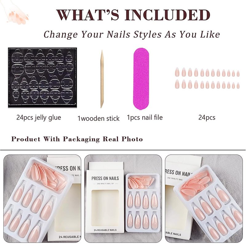 Package Includes: 24pcs/Box False Nail Tips + 24pcs Press glue + 1pcs Nail file + 1pcs Wood Stick