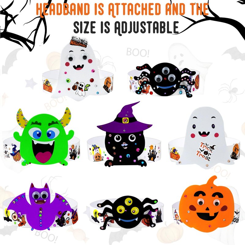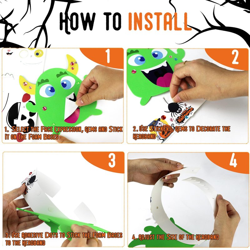 - Easy to Make: Halloween Headbands Craft Kits for kids are easy to make. You only need to stick expression to the foam base; then stick the foam base to the headband with adhesive dots, decorate the headband and foam base with glitter gem stickers and Halloween foam stickers; finally adjust the size of the headband. Sturdy and beautiful, let you and your family and friends enjoy the fun of DIY crafts kits
