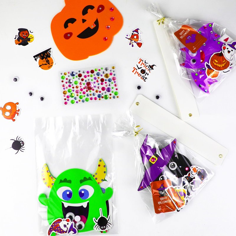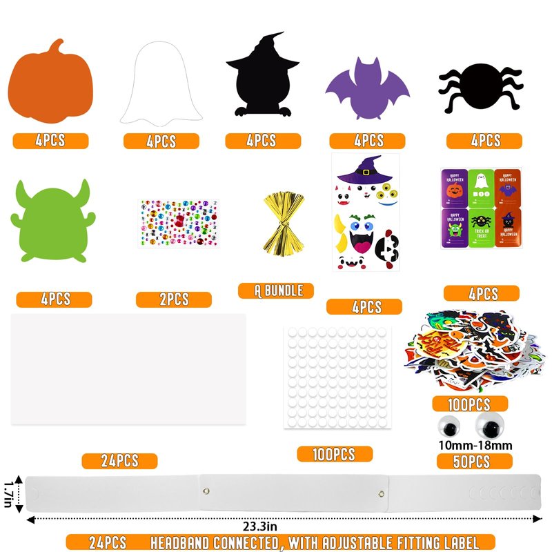 - 24 Halloween Crafts Bulk: This Halloween craft kits headbands adopts innovative combination form, materials supplies including 24 cardstock headbands, 24 foam bases in 6 shapes (pumpkin ghost monster bat spider cat), 24 sets of face stickers, 100 Halloween stickers, 50 googly eyes, 100 adhesive dots, 2 rhinestone stickers, 24 gift bags, 24 twist ties and 24 gift tags for gifting. Sufficient quantity to meet your creative needs
