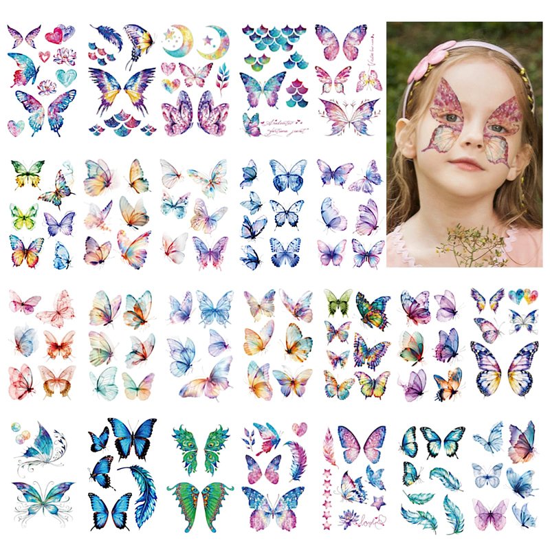 - GLITTER TEMPORARY TATTOOS - You will get 24 sheets glitter butterfly tattoos, more than 130 styles including various butterflies, hearts and angel wings elements, you can stick these colorful fake tattoos on arms, shoulders, backs, legs and any other parts of the body. Suitable for girls of all ages, make you more attractive on parties.