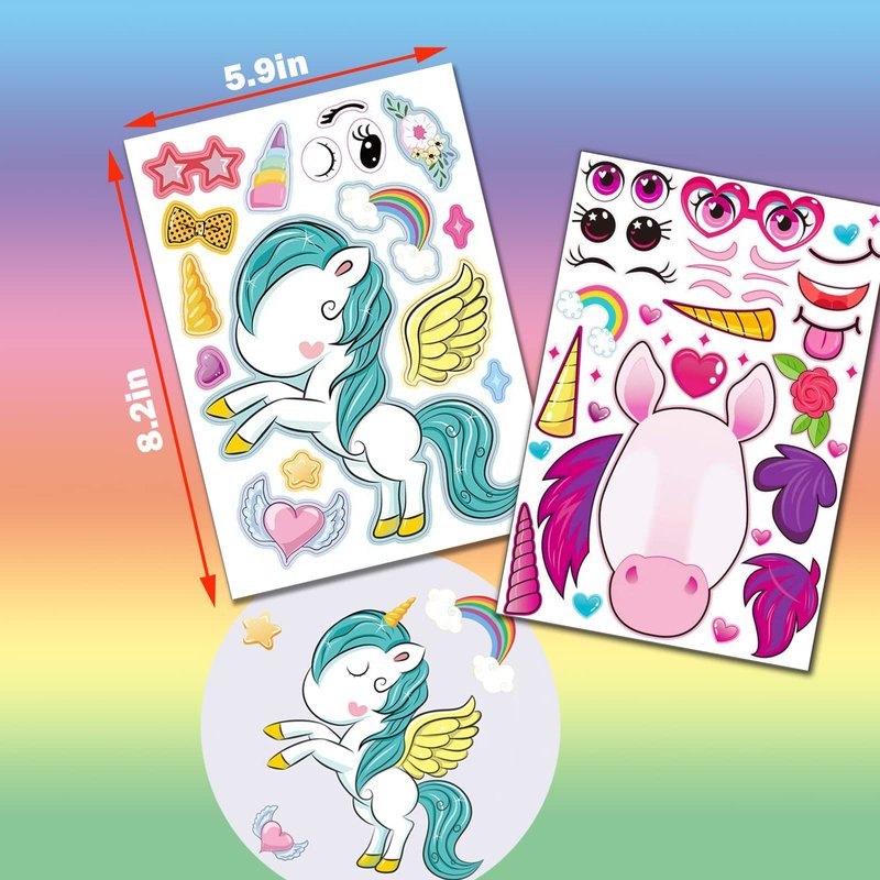 - Unicorn Party Favors for Kids: Each sheet of unicorn stickers has 3 kinds of eyes mouthes and other accessories,which let kids make unicorn faces with their own idea.The stickers (size:8.2x5.9in) are really great addition to unicorn party favor birthday goodie bag stuffers.