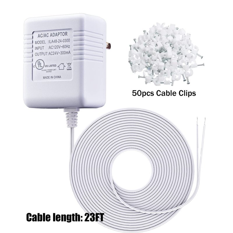 - 24 VOLT TRANSFORMER: Input 120V AC 60Hz; Output 24V AC 300mA; No-Load Voltage Max. : 28V AC; With 7M (23ft) long cable.