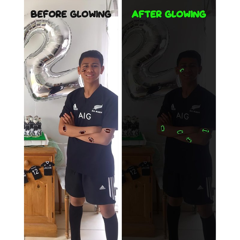 Our Luminous Football party tattoos are the perfect goodie bag favor,Perfect Party Accessory: a fun addition to any picnic, Sports party, day in the park, or at home activity
