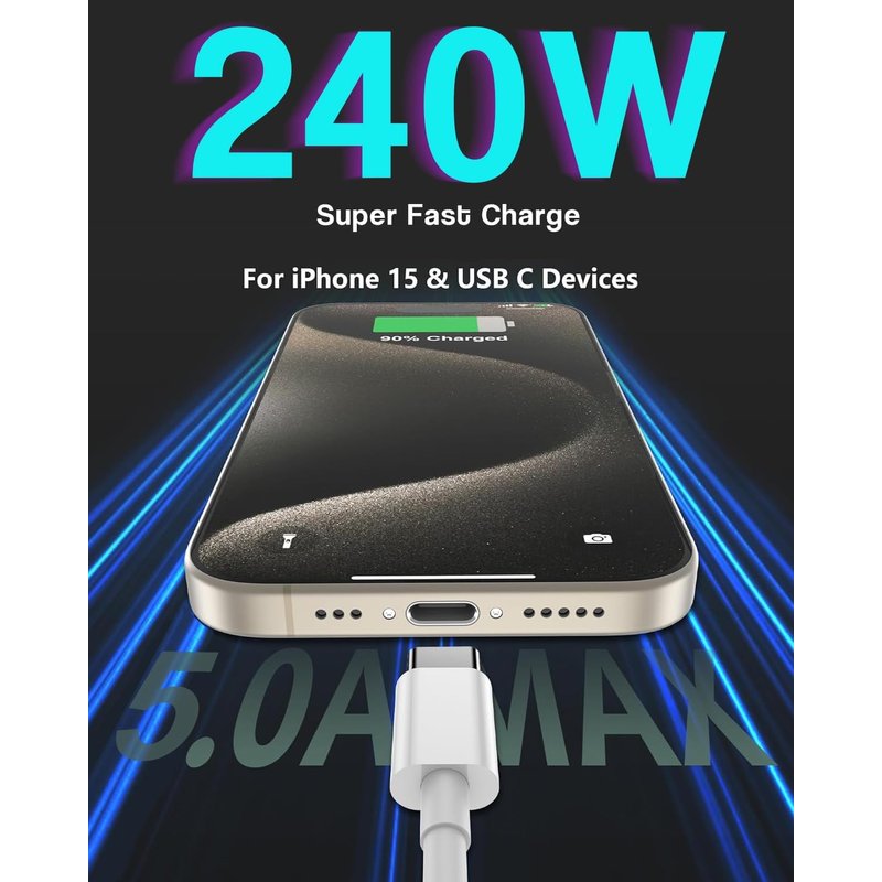 240W [2Pack] USB C to USB C Cable Compatible with MacBook Pro, MacBook Air, iPad Pro, iPad Air, iPad Mini 6, iPhone 16 15 Pro Max PlusWattage Output Compatible: 240W / 140W / 100W / 96W / 87W / 85W / 60W / 45W / 35W / 20W240 watt power output usbc to usbc cable is the newest charging technology so far in 2024.Within the next 5 to 10 years, this usbc to usbc fast charging cable can completely meet the demands of fast charging.Compatible USB-C end devices:-for MacBook Air (13-inch, M3 , M2)-for MacBook Air (15-inch, M3)-for MacBook Pro (14-inch, M3 / M3 Pro / M3 Max)-for MacBook Pro (16-inch, M3 Pro / M3 Max)-for MacBook Air (15-inch, M2, 2023)-for MacBook Air (13-inch, M1, 2020)-for MacBook Air (Retina, 13-inch, 2018-2020)-for MacBook Pro (13-inch, M2, M1)-for MacBook Pro (13-inch, intel, 2020)-for MacBook Pro (14-inch, M2 Pro / M2 Max, 2023)-for MacBook Pro (14-inch, M1 Pro / M1 Max, 2021)-for MacBook Pro (16-inch, M2 Pro / M2 Max, 2023)-for MacBook Pro (16-inch, M1 Pro / M1 Max, 2021)-for MacBook Pro (16-inch, intel, 2019)-for MacBook Pro (13-inch, 2016-2019)-for MacBook Pro (15-inch, 2016-2019)-for MacBook (Retina, 12-inch, Early 2015-2017)For iPad:-for iPad Pro M4 (13-inch, 11-inch, 2024)-for iPad Pro 6 (12.9-inch)-for iPad Pro 5 (12.9-inch)-for iPad Pro 4 (12.9-inch)-for iPad Pro 3 (12.9-inch)-for iPad Pro 4 (11-inch)-for iPad Pro 3 (11-inch)-for iPad Pro 2 (11-inch)-for iPad Pro 1 (11-inch)-for iPad Air M2 (13-inch, 11-inch, 2024)-for iPad Air 5 (10.9-inch)-for iPad Air 4 (10.86-inch)-for iPad Mini 6 (7.9-inch)-for iPad 10 (10.9-inch)Cellphone:-iPhone 16/16Pro/16Plus/16Pro Max-iPhone 15/15Pro/15Plus/15Pro Max-Galaxy S23/S23+/S23 Ultra/S22/S21/S20/S10-other USB C DevicesPackage Include:2Pack* USB C to USB C Cable 240W(3.3FT)