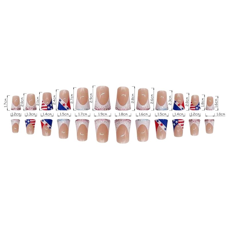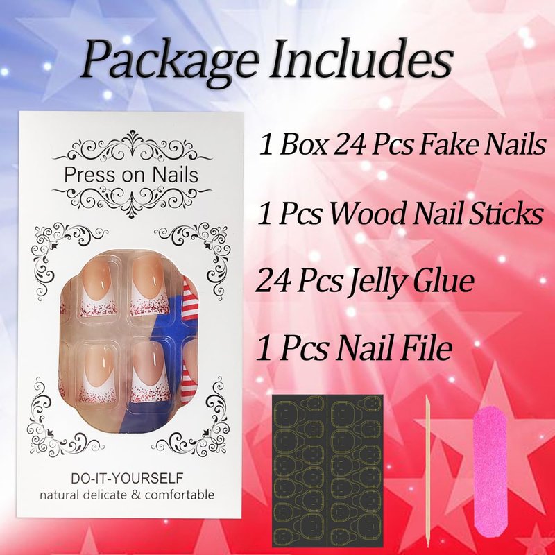 - Package Contains: You will get 24 pieces 4th of July acrylic press on nails in 12 sizes,1 piece nail file, 1 piece nail double-side stickers, 1pcs wooden stick for removing nails tips. Unique fashion design, make you more sweet and charming.