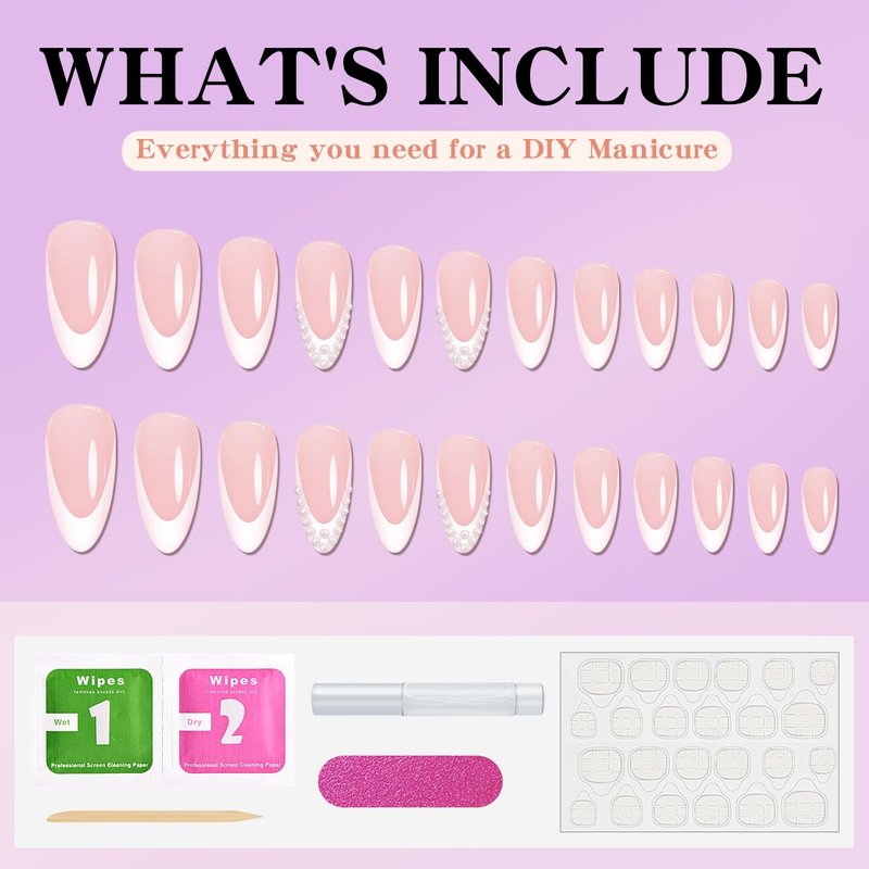 24Pcs Almond Shaped Press On Nails,Almond Press On Nails,Almond Nails Press On,White French Tip Almond Nails Medium Fake Nails with Pearl Design Artificial Nails Stick on Nails For Women