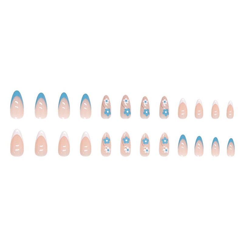 24Pcs Blue & White French Tip Press on Nails Medium Fake Nails Almond False Nails with Blue & White Flowers Designs Nude Translucent Acrylic Nails Swirl & Glossy Glue on Nails Spring Nails for Women