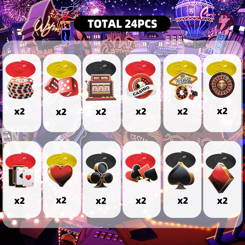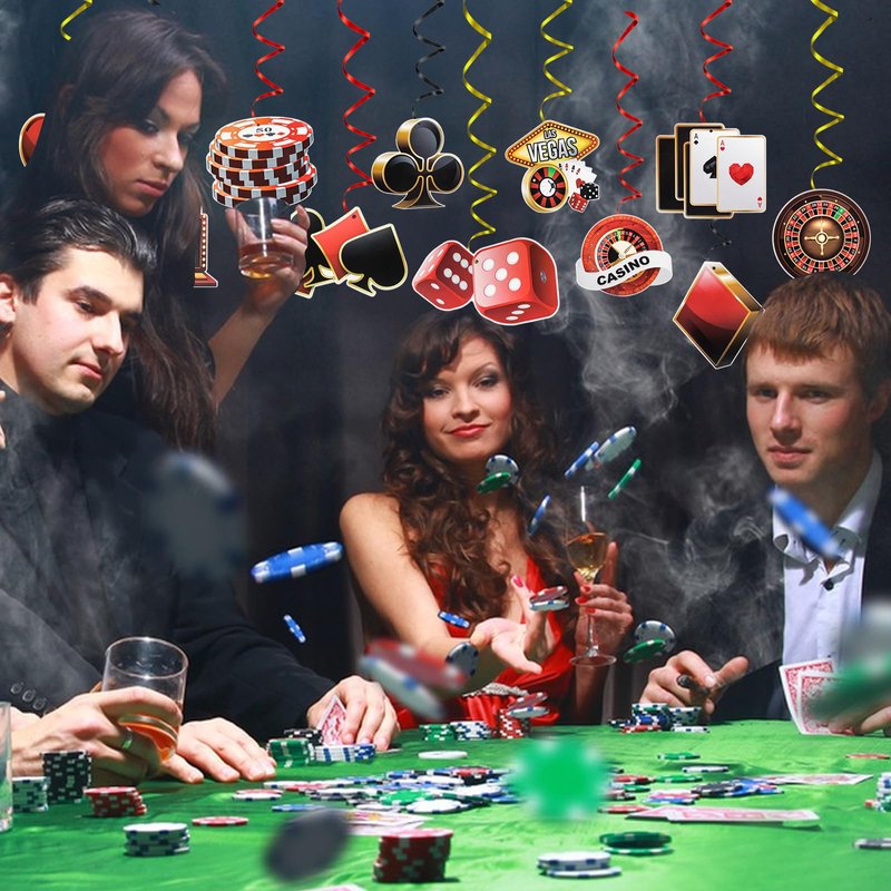 - WHAT YOU GET - The package contains 24 pieces of 12 different casino style ceiling hanging swirls with poker, chips, dice and slot game elements in classic red and black. Add casino party atmosphere and create unforgettable memories for you and your friends.