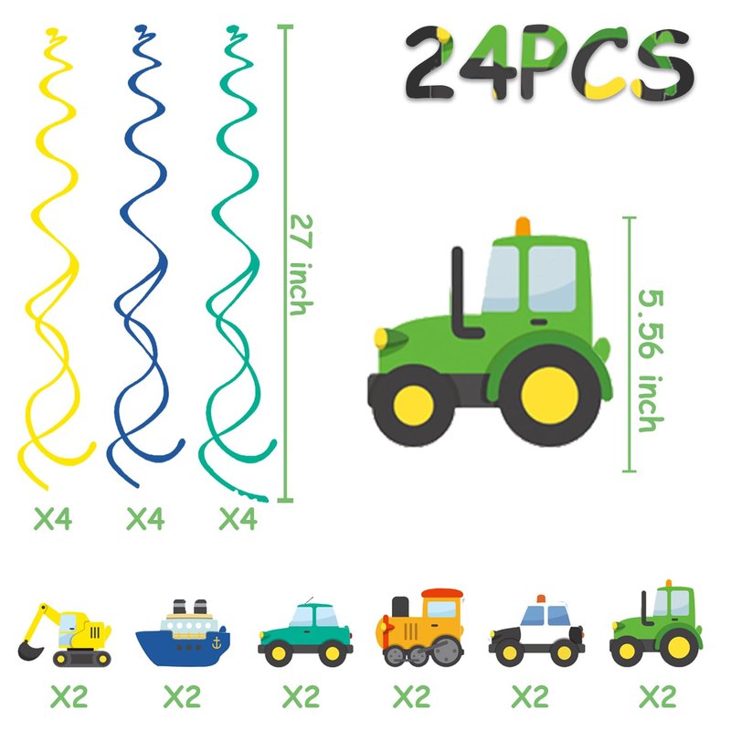 24PCS Construction Hanging Swirl Cruise Party Decorations for Boys Kids Theme Birthday Party Supplies Construction Hanging Spiral Garlands Ceiling Decor (Vehicle)