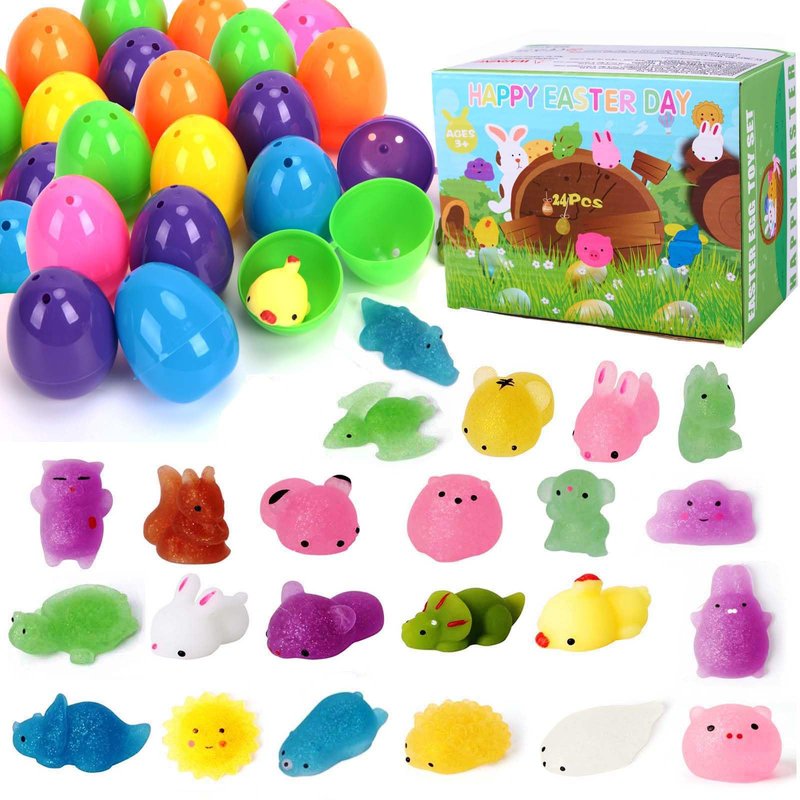 - 【 Great variety】 Mochi squishy prefilled easter eggs includes 24 pieces mochi squishy squeeze animal toys inside the bright colorful plastic easter eggs.Excellent packaging and individually-wrapped inside each egg for freshness.Making for an easy Easter! Convenient!