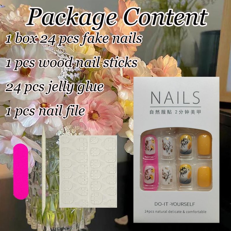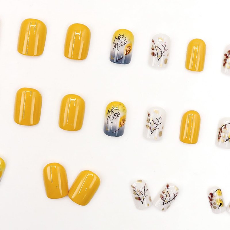 • 【Easy to Apply】Full cover yellow fake nails set are instead of spend lots time and money at nail salon, you can change you nails style in 15 min anytime and anywhere.(The leaf false nails will stay longer if you clean your nails before use, and avoid water within the first hour of wearing)