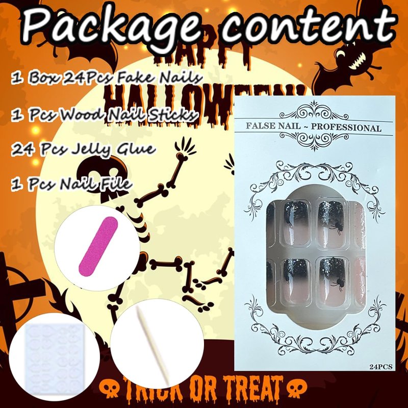 - 【Halloween Short Press on Nails Kit】You will get 24pcs Halloween press on nails short nails,1pcs nail file,24pcs jelly glue sticker,-1pcs wooden stick for removing false nails.Jelly glue is not as durable as liquid glue, but it makes fake nails reusable. Please use suitable glue according to different scenes.