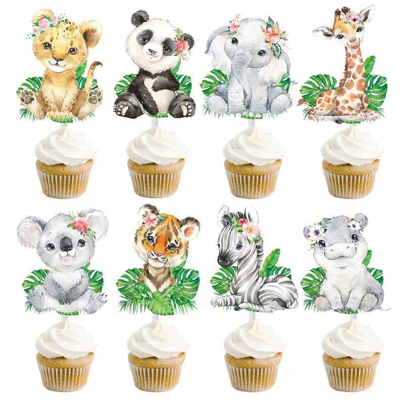 - 🍬【24Pcs jungle safari animal cupcake toppers】Package includes 24pcs lovely baby jungle safari animal cupcake toppers in 8 patterns. 8 cute animals include elephant, tiger, hippo, zebra, griaffe, koala, panda and lion. Once you open the package, you can insert your cake and decorate your birthday cake directly. It will make your cake more attractive and delicious.