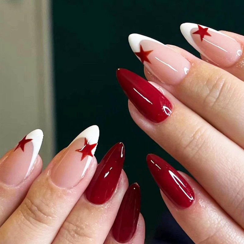 24Pcs Medium Almond Press on Nails Gel Glue on Nails for Manicure Art. Glossy White French Tips Acrylic False Nails With Dark Red Star Design. French Full Cover Fake Nails Stick on Nails for Women