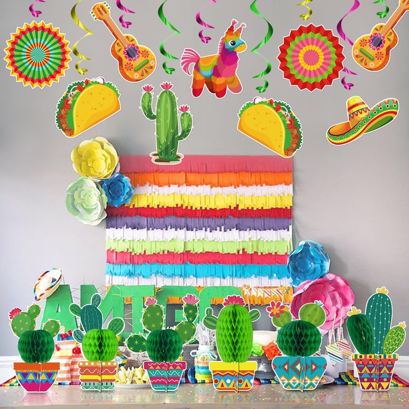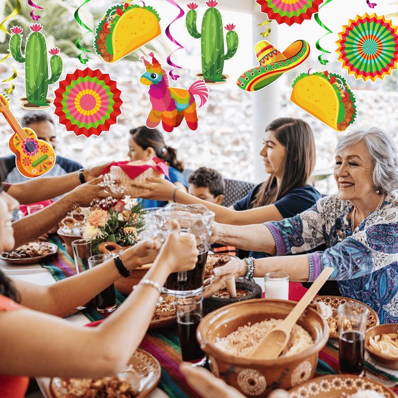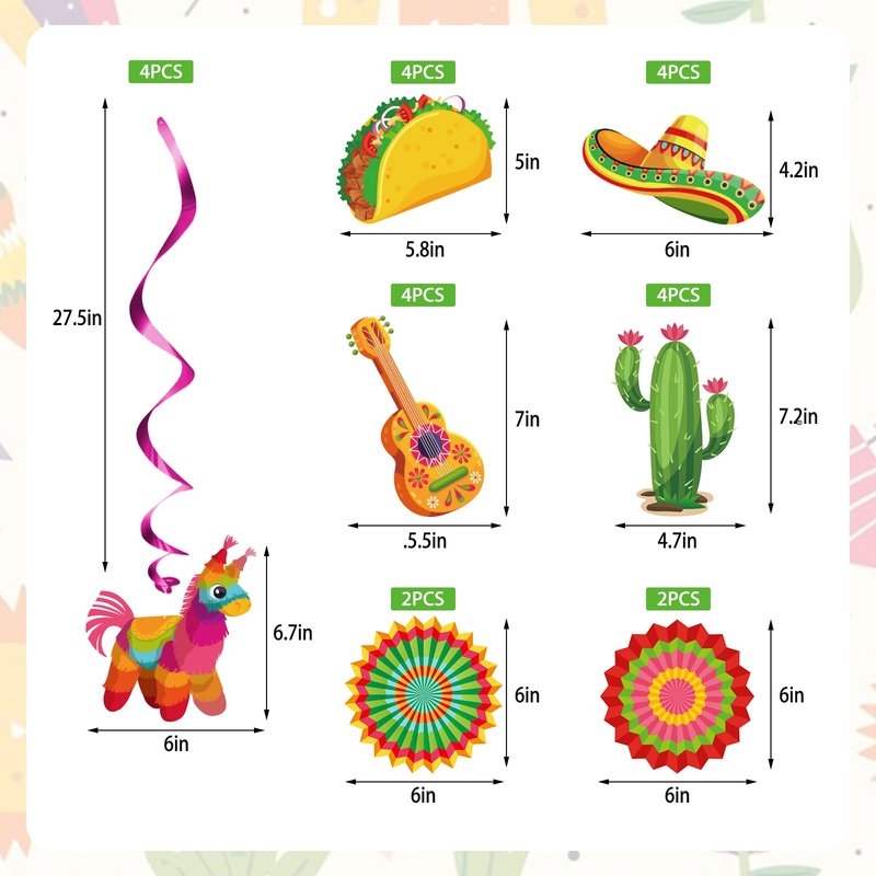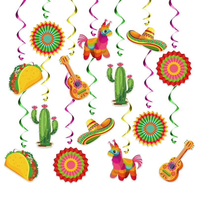 - Perfect Mexican: themed Party Decoration - Turn any occasion into a lively celebration with our vibrant Mexican Fiesta Hanging Swirl Party Decorations. The package includes 24 foil swirls and 20 cutouts, featuring 7 different cute designs that capture the spirit of a Fiesta Party, Mexican Party, Cinco De Mayo, Taco Tuesday, and more.
