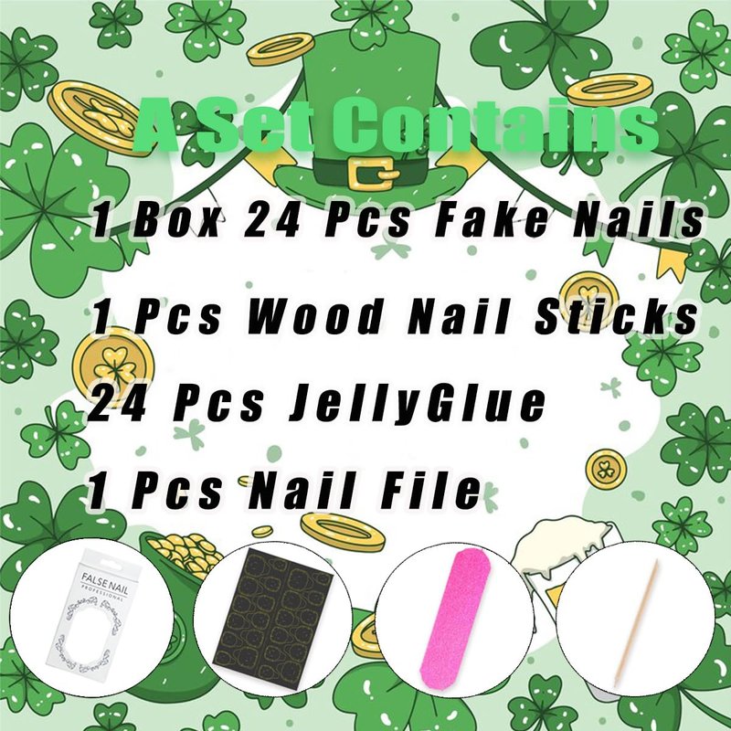 - ☘️St. Patricks Nails: You will get 24 pieces clover press on nails in 12 sizes,1 piece mini nail file, 24 pieces nail double-side stickers, 1 piece wooden stick for removing nails tips. Jelly glue is not as durable as liquid glue, but it makes short square fake nails reusable. Please use suitable glue according to different scenes.