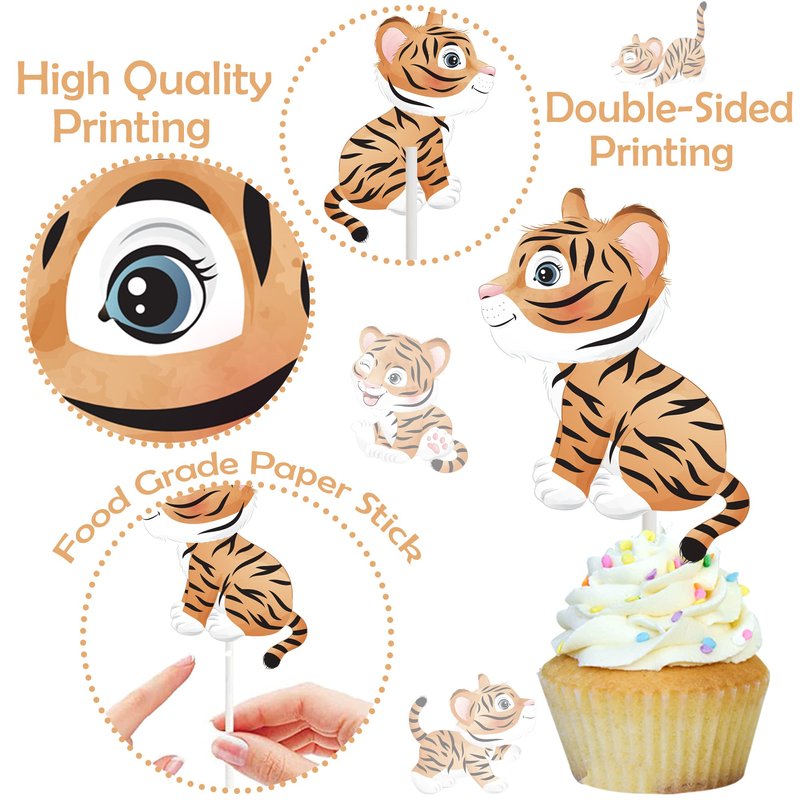 - ❤【Double-sided safari baby shower decoration】Double-sided and chic design make your tiger cupcake toppers an ideal decoration for birthday cake. Tiger shaped cut outs are professionally printed on heavy-duty cardstock paper with a photo-like shine. They are beautiful enough to arouse your interest. Personalized tiger pattern cupcake toppers will make your cake to stand out at the party.