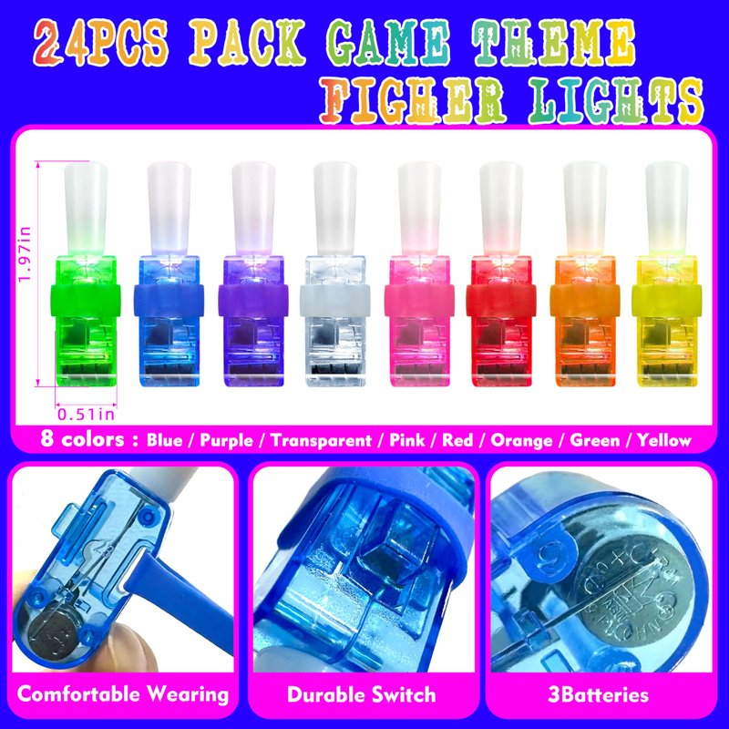 Feature: Includes 24 LED finger lights in 8 designs Patterns: neon video game machine, gamepad, "GAME ON" fonts, toy pistol.