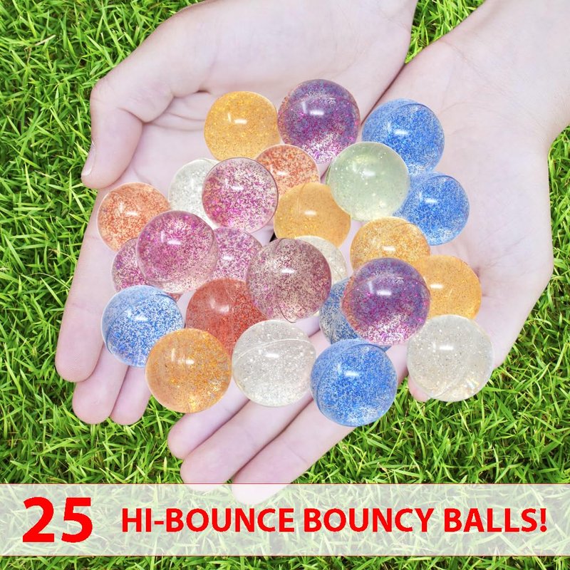 - VALUE PACK – Includes 25 high bounce 1 inch (27mm) clear balls with a variety of colored glitter, providing an abundance of small rubber balls for various activities.