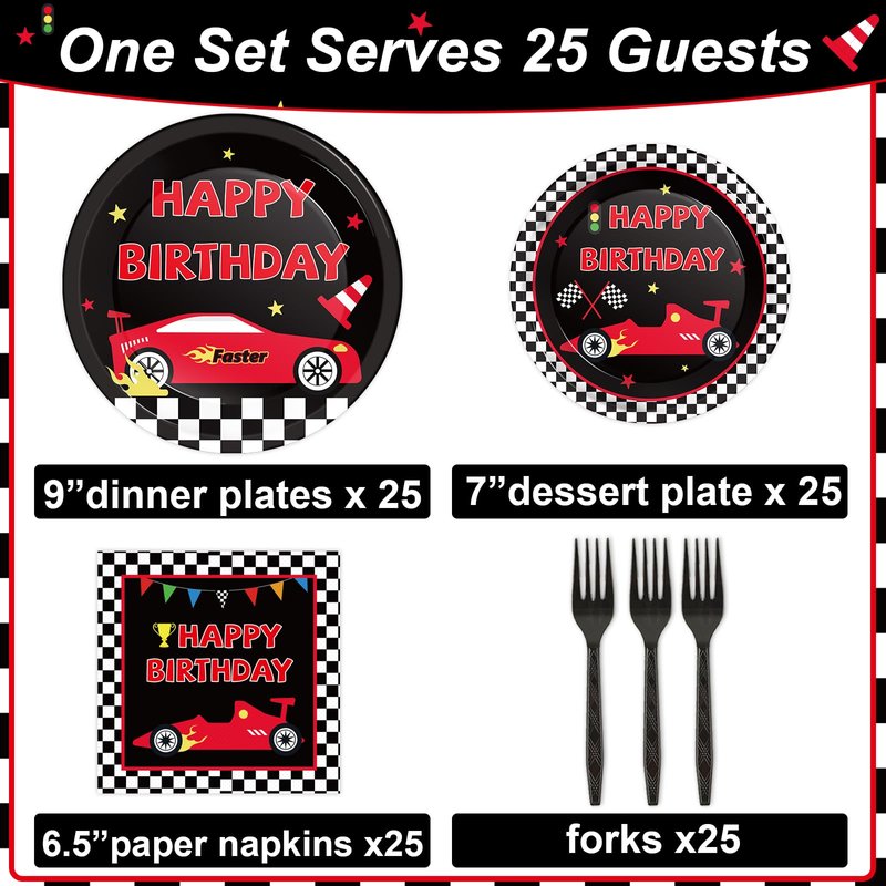 - 【Racing Car Party Tableware Set】100 pieces racing car dinnerware set, including 50 paper plates of two sizes, 25 racing car birthday napkins, and 25 forks. This set includes everything you need for up to 25 guests, making it the perfect choice for your racing car birthday party.