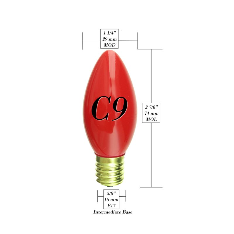 Our C9 shaped light bulbs are available in all standard colors and feature a ceramic red paint that is guaranteed to last the life of the bulb. These 7 watt, 130 volt bulbs have an hour life of 4000 hours. They are safe for both indoor and outdoor use allowing you decorate both the house and tree for Christmas! Each of these bulbs measures 1 1/4" wide, 3" tall and features a brass Intermediate (E17) base.