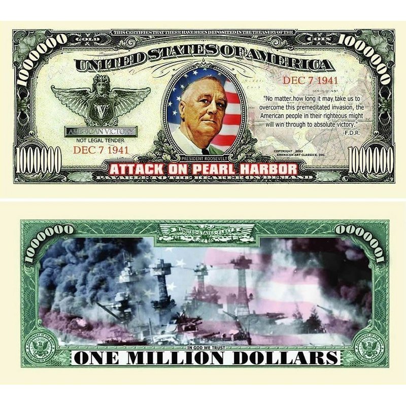 25 Pearl Harbor Million Dollar Bills with Bonus “Thanks a Million” Gift Card Set