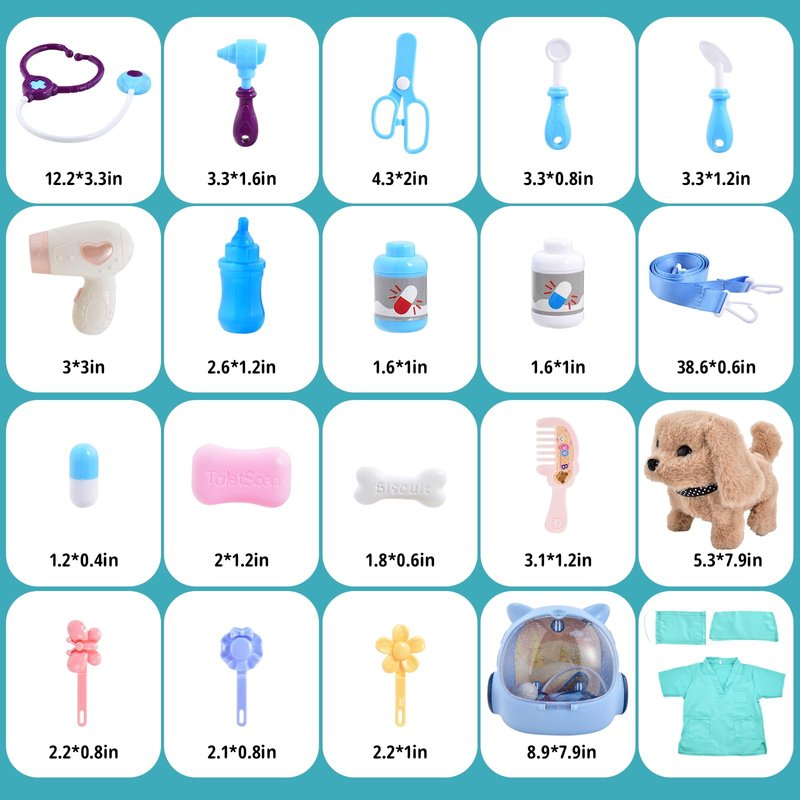 - 1. 【Luxurious Pet Care Set】: This comprehensive vet toy set includes an electronic shaggy dog, backpack, toy medical tools, and other accessories that let young ones play pretend doctor and care for their furry friends. Hours of entertainment for your child await!