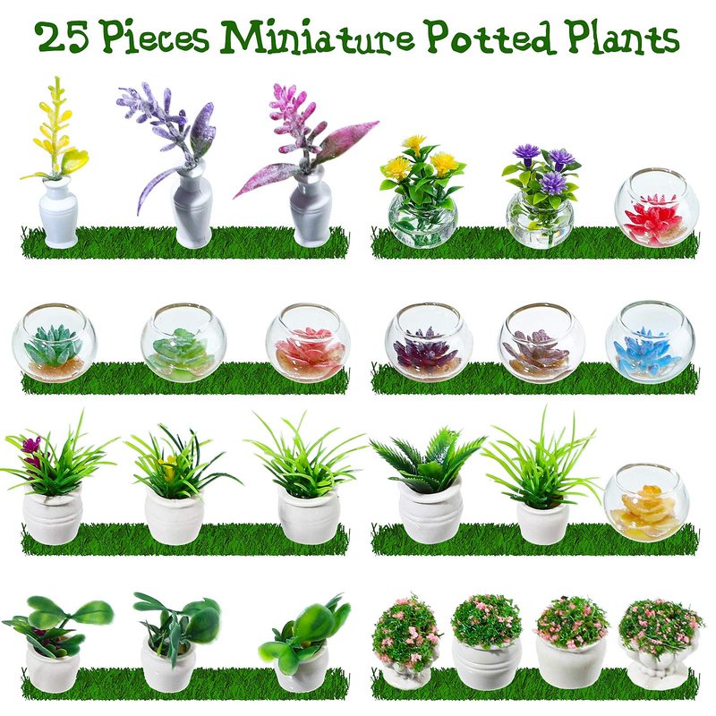 25 Pieces Dollhouse Potted Plants Miniature Artificial Plant Tiny Bonsai Model Mini Flowerpot Fake Succulent Doll House Mini Plant Model Figure for 1:12 Dollhouse Decor Mini Garden (Fresh Style)