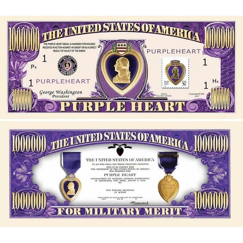 25 Purple Heart One Million Dollar Bills with Bonus “Thanks a Million” Gift Card Set