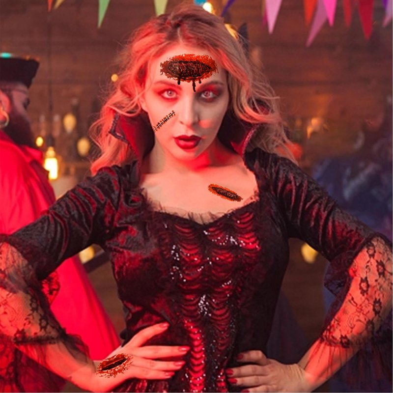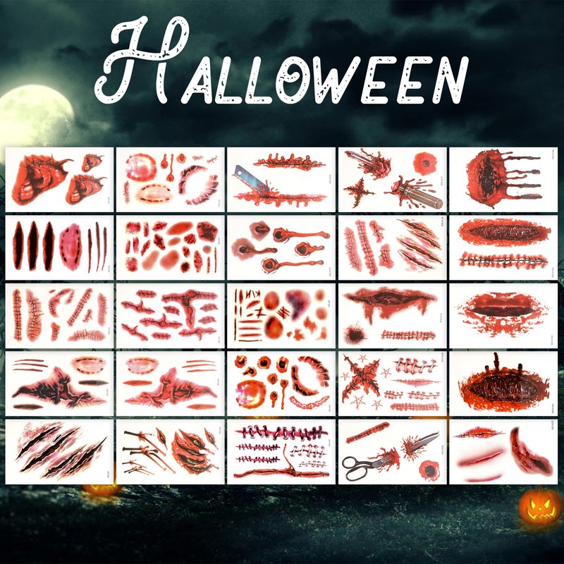 • 【PREMIUM QUALITY】The Halloween wound temp tattoos are made of water to paper, environmentally friendly ink, environmentally friendly glue, PET protective film meeting rigid safety and non-toxic materials requirements. Using the semi permanent tattoos will last 3-5 days on your body, which is enough time for a perfect party. (Tips: Do not apply to sensitive skin, near eyes, or if you are allergic to adhesives.)