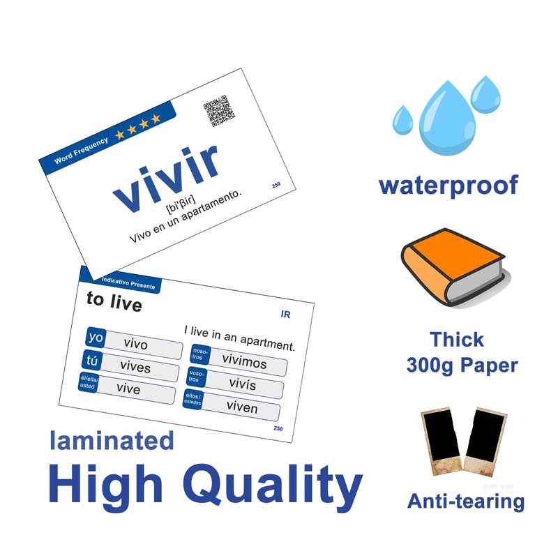 - [High-quality Spanish flash cards suitable for beginners to intermediate learners]: This set of 251 Spanish verb flash cards, including verb charts, is highly suitable for adults learning Spanish. Whether you're waiting somewhere or in any other situation where you expect to have some free time, you can conveniently carry a stack of flashcards with you for enhanced practice and review.