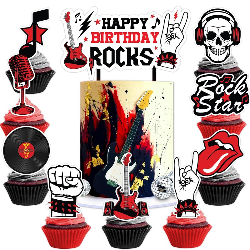25PCS Born To Rock N And Roll Rocks Happy Birthday Cake Topper Cupcake Toppers Party Themed Table Decorations Favors Supplies Decor Music Notes 50s 60s for Kids Adults Boys Girls Teen Rewards Carnival