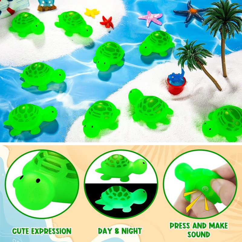 - GLOWING AND SQUEEZING FUN: Our swimming turtle has an upgraded glowing design, when you play in the dark or at night, the turtle bath toys will emit a soft glow of night light, lighting up the night pool, bathing room; squeezing will also squeak, you can use it as a gift to accompany your baby's bath, to attract your child's attention and improve focus