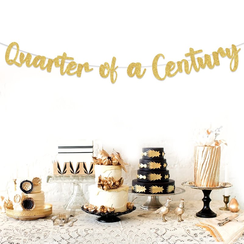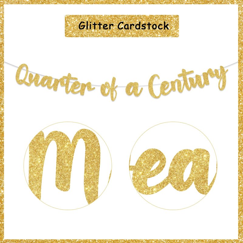 - Material: Quarter of a Century banner is made of gold glitter cardstock. It’s shiny for him or her 25 years old birthday.