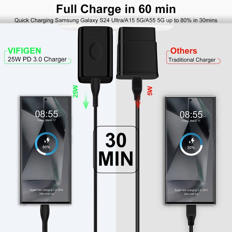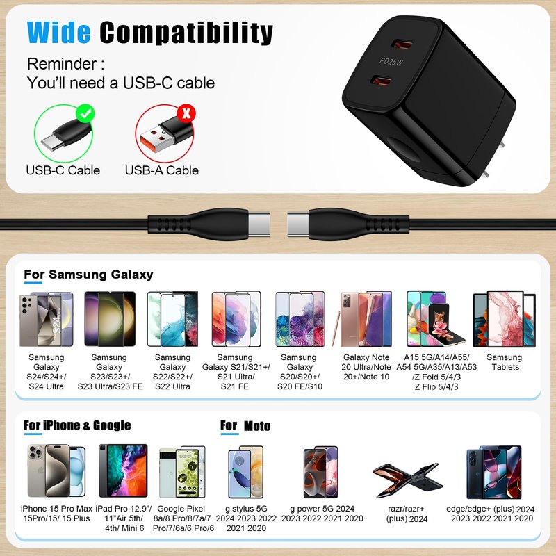 - 【C Type Fast Charger Block】super charger type c delivers a turbo speed up to 25 Watt/ 3 Amps compatible with Motorola razr plus 2024/razr 2024/razr 2023/razr plus 2023,Edge 2024,Moto G Stylus 5G 2024 2023,Edge 50 Ultra,Edge 50 Pro,Edge 50 Fusion,G Power (2024)/G Play/G Pure,Razr 50 Ultra,Razr 50,G85;Samsung Galaxy S24 Ultra S24+ A15 5G A14 A54 A55 A35 A13 A25 S23 FE S23 Ultra S23+,A23 A53 A03s,Z Flip 6 5,Z Fold 6 5,S22 S21 S20;iPhone 15;Google Pixel 9 Pro Fold XL 8a 8 Pro 8 7a 7 6.