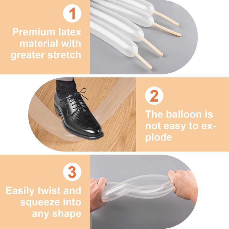- Suitable For All Occasions: Stretch the long balloons for balloon animals 3-5 times before inflating, after inflating, easily twist and squeeze into any shape, clear long balloons are perfect for Christmas, thanksgiving, Halloween, kids' party, graduation party decorations