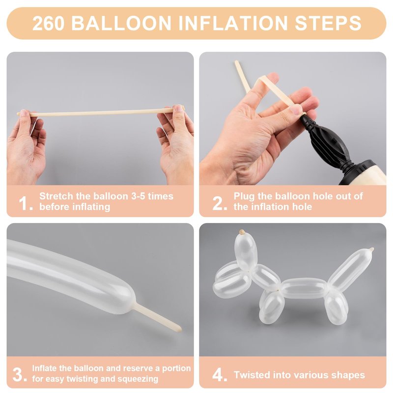 - 260 Balloons Clear: Take you and your child into the creative world of balloons, these magic long balloons, can easily twisted into various fun animal balloons or shapes, like dogs, flowers etc, it can develop children's imagination