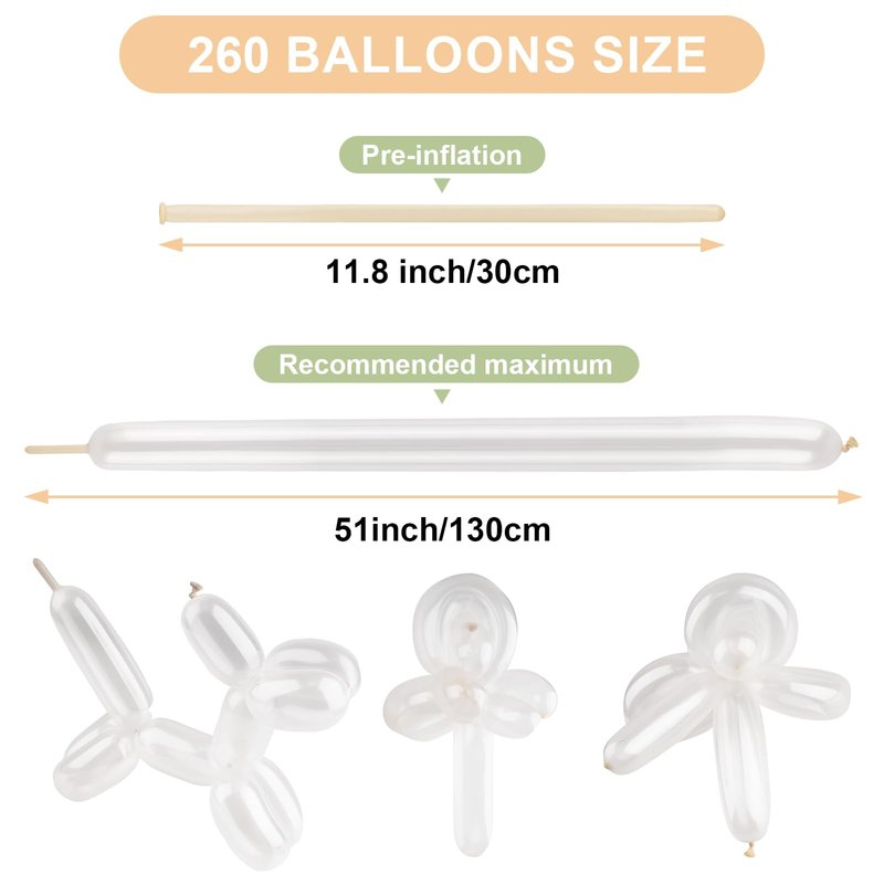 - 100 PCS Long Skinny Balloons: These long clear 260 balloons, can meet your various balloon decoration needs, pre-inflation:11.8inch/30cm, maximum:51inch/130cm, please reserve 10-15cm during inflation to prevent balloon animal balloons from popping
