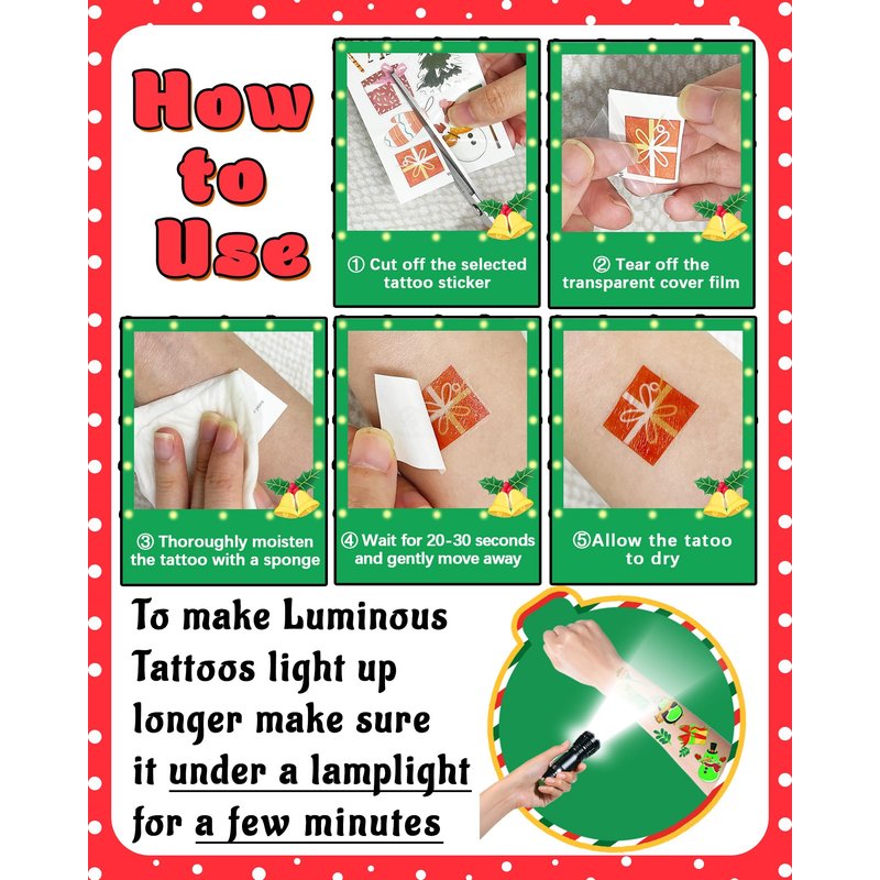 - PREMIUM QUALITY: All Christmas party favors are made of high-quality materials, safe and non-toxic, waterproof. To make luminous tattoos light up longer, make sure it under a lamplight for a few minutes. The longer it absorbs the light, the longer it will glow in the dark.