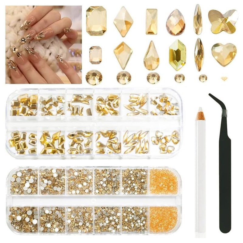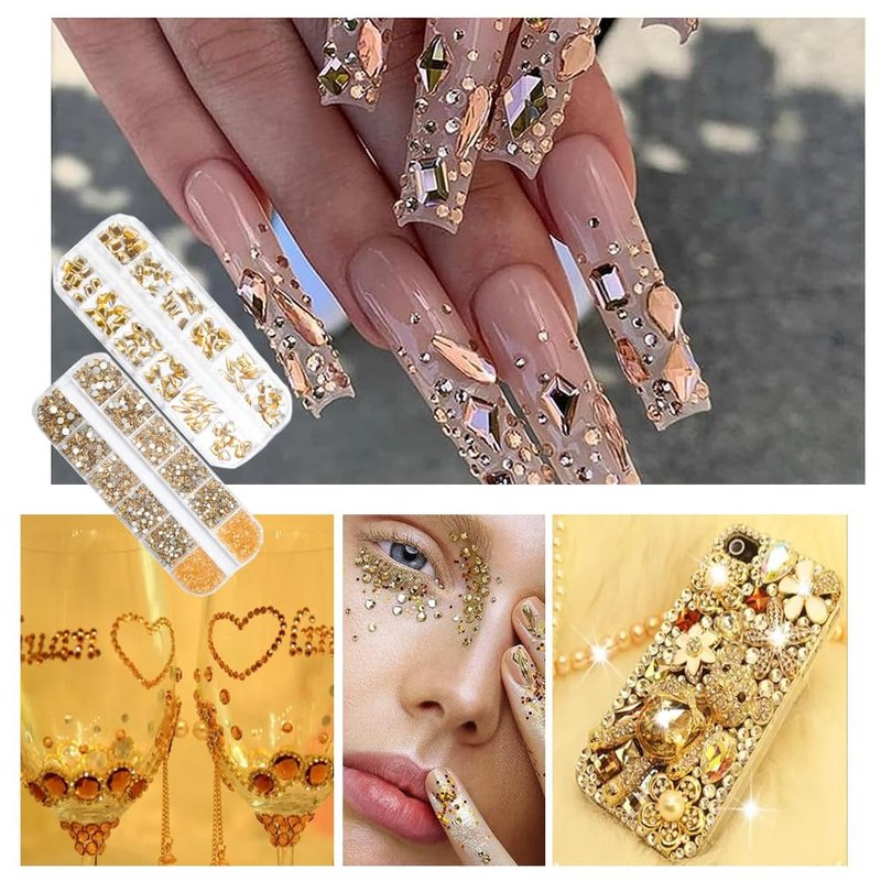 - 【120 Pcs Multi-Functional Nail Art Rhinestones】This gold gem nail rhinestones set is perfect for creating 3D nail art or decorating jewelry, makeup, Body Art, DIY Crafts, Wedding Dress or Shoes, Cell Phone Cases, Glasses, Greeting Cards, Bags, Guitars, Scrapbooks etcDIY clay production, DIY craft projects, clothing, wedding dresses, books, Christmas decorations, gift packaging, decoration, ceramics, greeting cards, logos, faces, eyes, cosmetics, computers, phone cases, invitation letters, etc.
