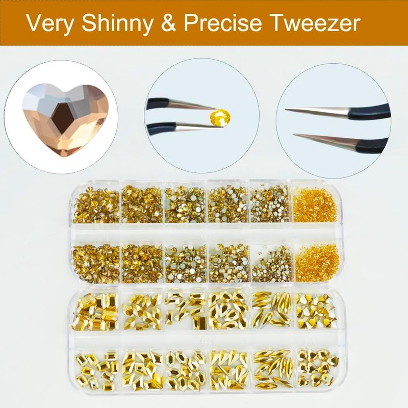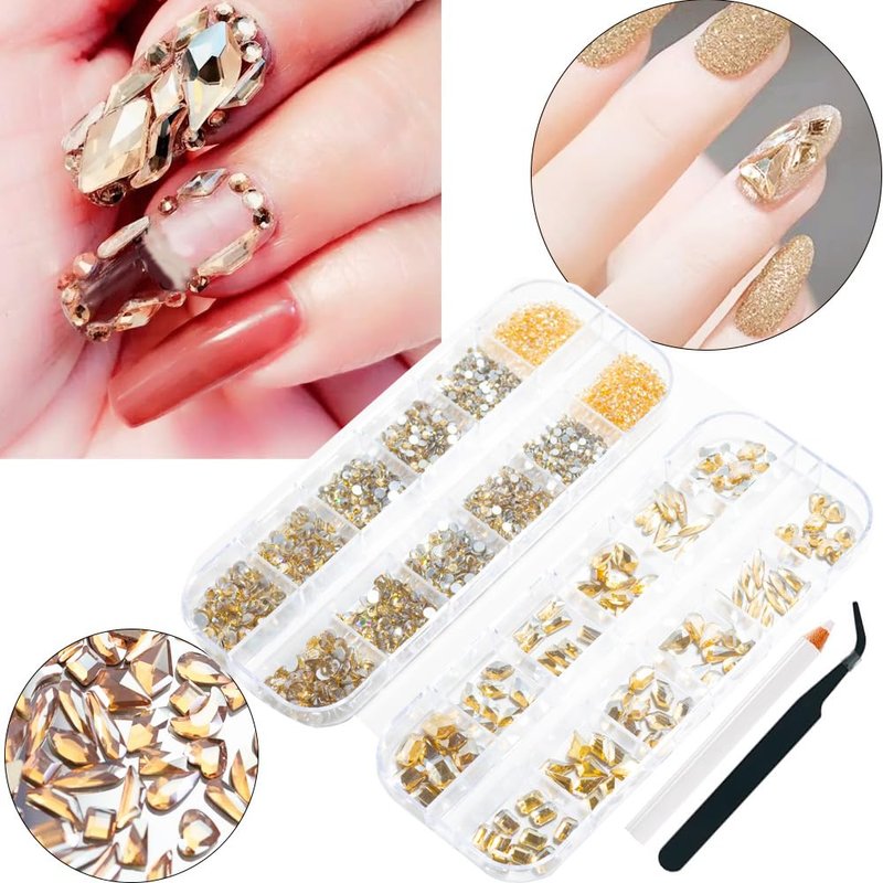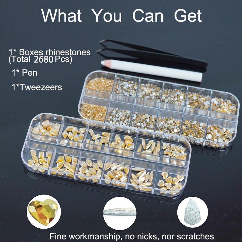 - 【Package Contain】You will get 2 boxes gold nail rhinestones, 1 box about 2560pcs Champagne Gold flatback round beads and 1 box about 12 kinds of different shapes Rhinestones(120 pcs). Meetting your different needs every day, you can do all kinds of bold and stylish nail designs.