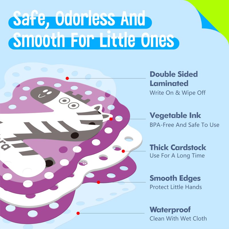 High Quality and Durable: Our lacing cards are made of sturdy cardstock with premium material that ensures long service time and durability. All cards are printed in reliable vegetable ink, which will not release harmful substances, and the smooth edges can protect little hands, making it safe to use. The laces are made of high quality polyester, which is not easy to break and is long-lasting.
