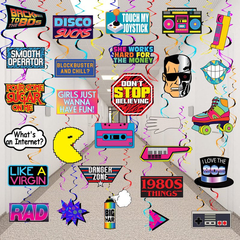 28 Piece 80s Party Hanging Swirls Decorations, Throwback 1980s Themed Party Supplies and Favors