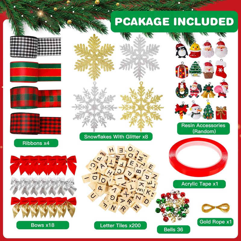 - 284 Pieces Christmas Ornaments - Christmas tree ornaments included 200 x letter tiles, 18 x bows, 4 x ribbons, 8 x glitter snowflakes, 16 x resin accessories, 36 x bells, 1 x acrylic tape, 1 x rope.