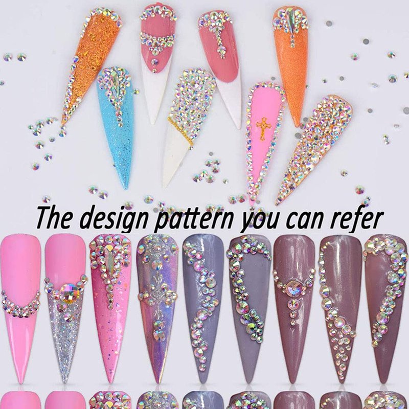 • Easy to Use: Apply your nail tips with gem glue, use the rhinestone picker dotting pen to pickup the ab crystal rhinestone, then place the flat back glass rhinestones into the ideal nail surface you want to stick, ensure to stick firmly, apply a thin layer of no wipe top coat gel, cure UV/LED lamp for 30-60s will be done.