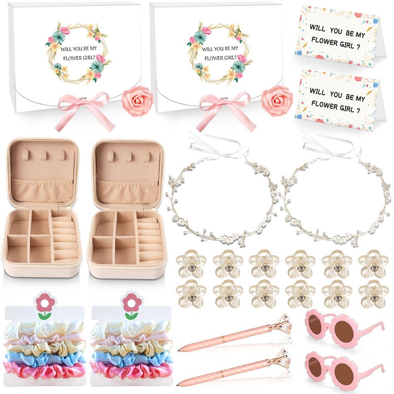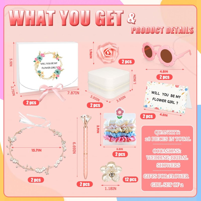 - 28PCS FLOWER GIRL PROPOSAL:Flower girl Box * 2pcs; Pink Ribbon*2pcs;Flower sunglasses * 2pcs; Flower girl Headpiece*2pcs;Jewelry Box* 2pcs; 6pcs small flower hair clip sets * 2; Pink diamond pens * 2pcs; 5 mixed color hair ring sets * 2pcs; Pink Flower * 2pcs; will you be my flower girl card*2pcs.