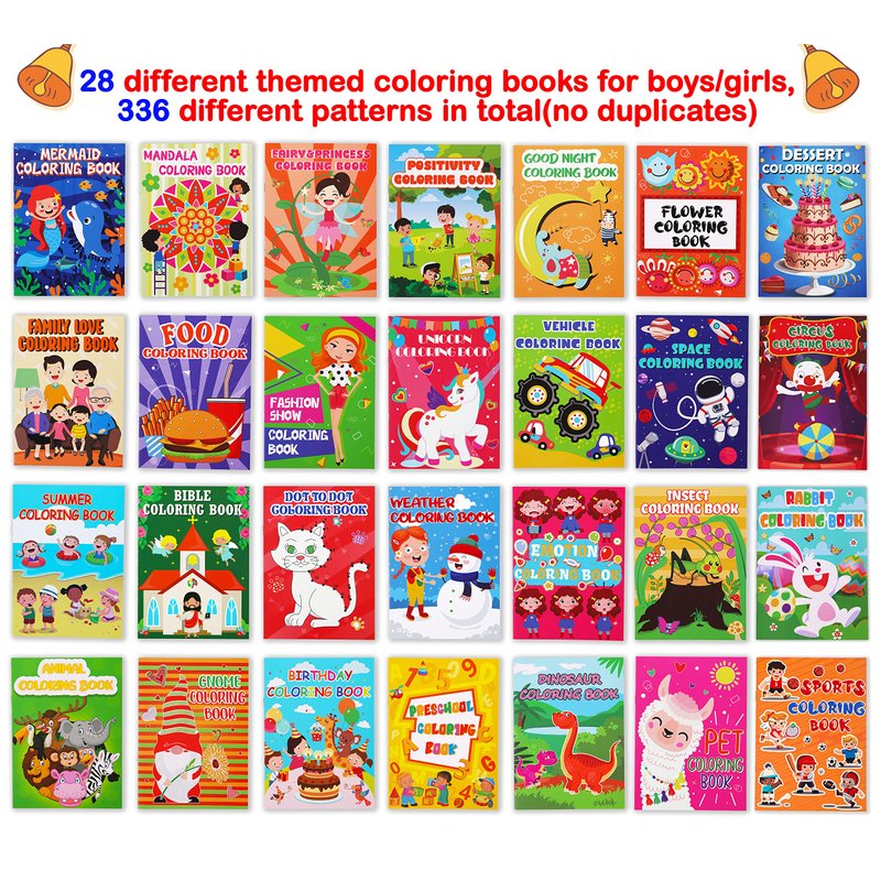 - An assortment of coloring books - There are 28pcs varied kids coloring books in the package.Each book has 6 pages in double-sided printing.336 different patterns in total.(no duplicates)