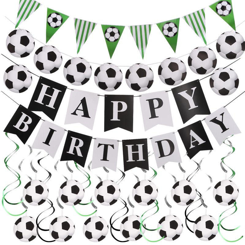 - 28Pcs Soccer Party Decorations: The set includes 1 set HAPPY BIRTHDAY banners, 1 set triangle flags, 1 set soccer banners, 12pcs hanging swirl soccer cutouts, 6pcs black spiral streamers and 6pcs green spiral streamers, making it a perfect addition to any soccer themed celebration