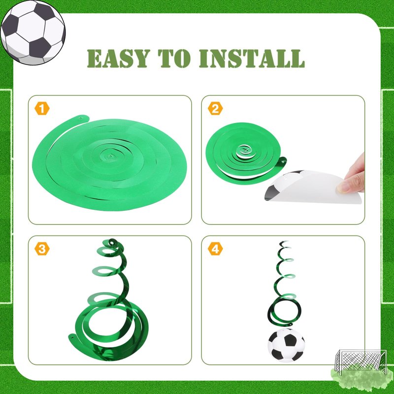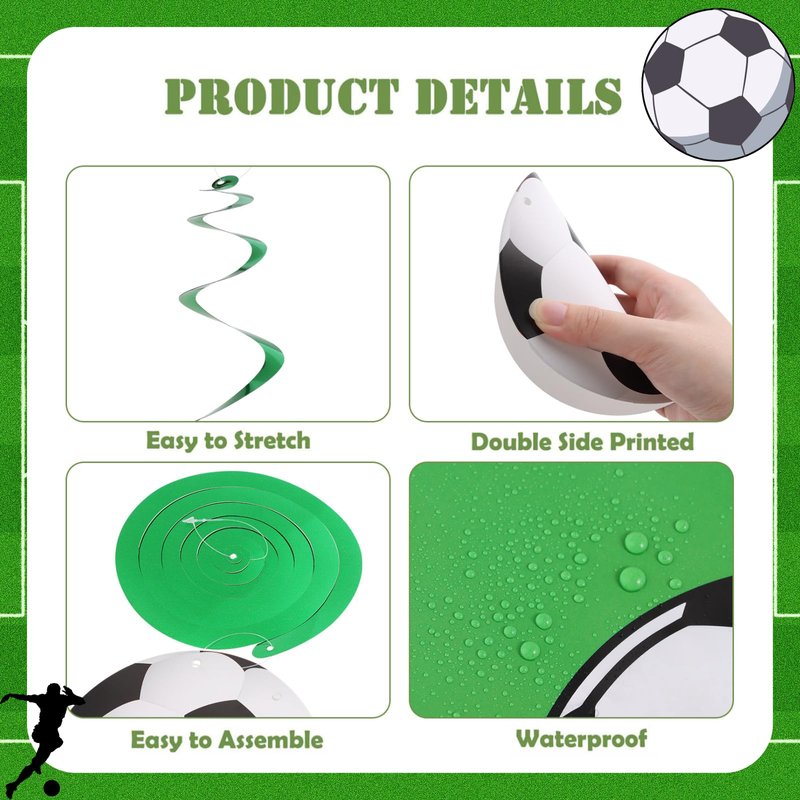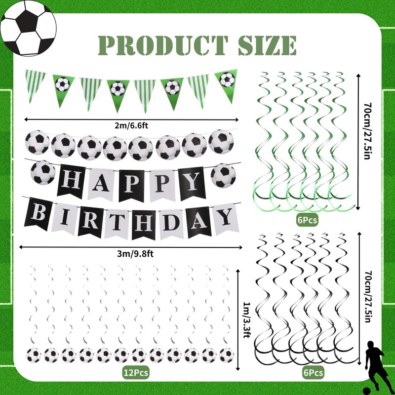 - Size: HAPPY BIRTHDAY banners 3m/9.8ft, soccer banners 3m/9.8ft, triangle flags 2.1m/6.9ft, hanging swirl soccer cutouts 1m/36in, spiral streamers 0.7m/27.5inch; Add a festive touch to your soccer themed party with these vibrant soccer hanging decorations;