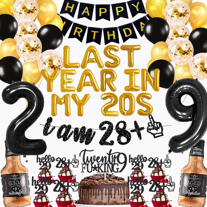 - You will get: 1*happy bIrthday banner,1 pack glitter i am 18+1 banner,1 pack 16in"last year in my 20s" letter balloons ,1*29th cake topper,10*cupcake topper, 2*glaint Whiskey Balloon,1 pack 32in number "29"balloon(can support helium),2*tinsel curtain,20*12in latex balloons ,some straws for inflating the balloons and 1pcs string to hang these balloons.